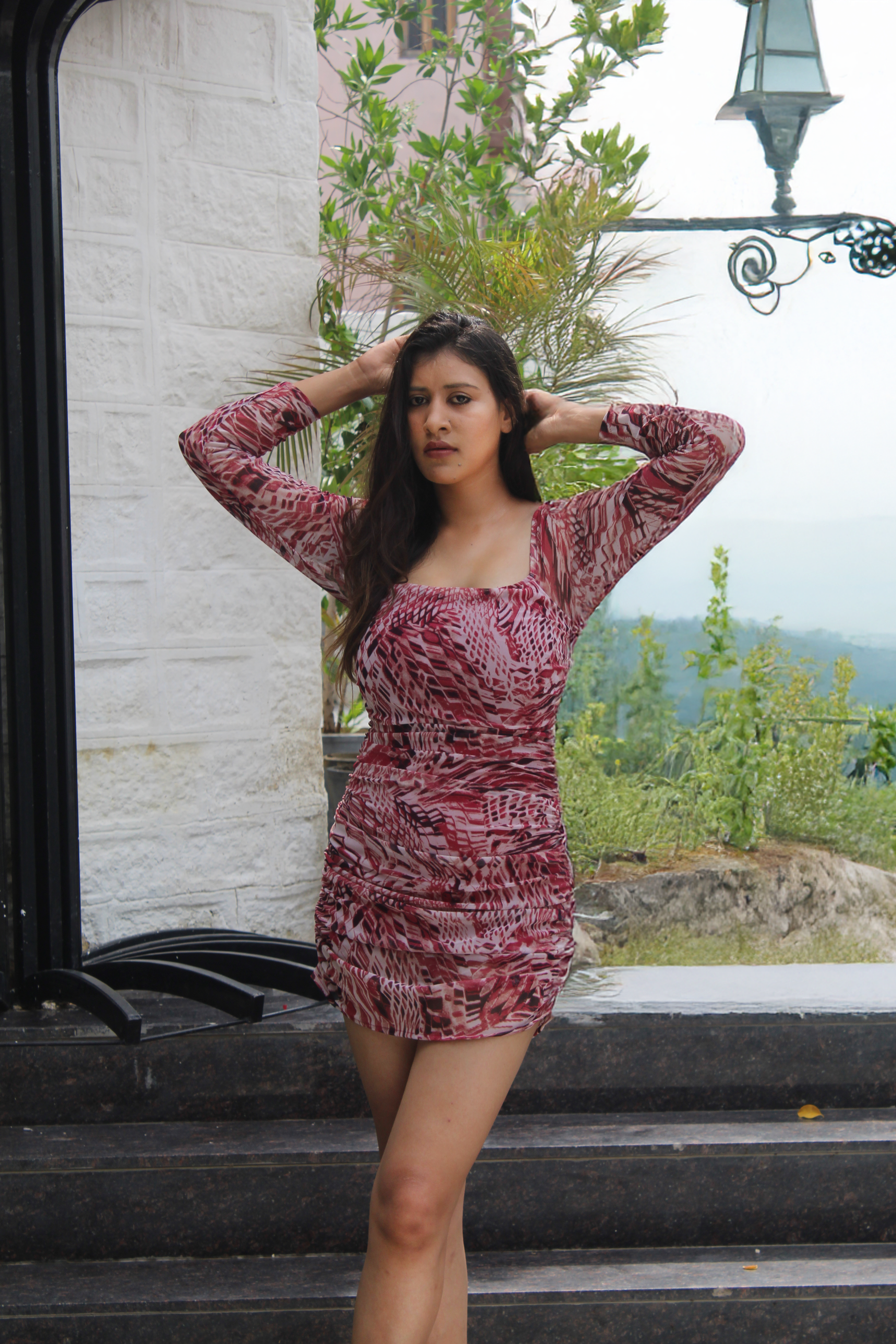 Turn heads in our Crimson Rush Ruched Mini Dress, a bold statement-maker that hugs your body in all the right places. Featuring a stunning abstract print in deep red tones, this dress brings together edgy attitude and feminine flair.